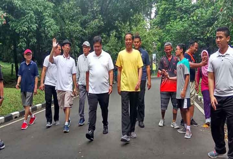 Presiden RI Joko Widodo dan Menteri Perindustrian Airlangga Hartarto olah raga bersama di sekitar Istana Bogor pada Sabtu (24/03/2018). Keduanya mulai berjalan kaki sekitar pukul 08.00 WIB. Jokowi memakai kaos berwarna kuning, sementara Airlangga yang juga merupakan Ketua Umum Golkar itu mengenakan kaos berkerah warna putih. Selama berolahraga bersama, keduanya tampak berbincang santai. “Pak Airlangga mau lihat sepeda motor.… Continue reading OBROLAN SANTAI SAMBIL BEROLAHRAGA JOKOWI DENGAN AIRLANGGA HARTARTO